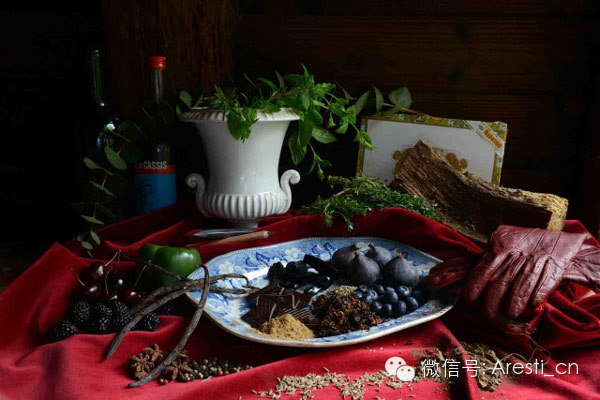 盘子中间放着巧克力、甘草、烟草和混合的棕色香料,还有些小豆蔻、紫色无花果和蓝莓。那只深色盛放黑醋栗酒的瓶子来自七十年代,还有一些现代物品,包括石墨、红色的皮手套、雪茄盒。赤霞珠的新鲜药草味道,在这里以百里香、薄荷和迷迭香表现,背景中还有一簇桉树叶。
